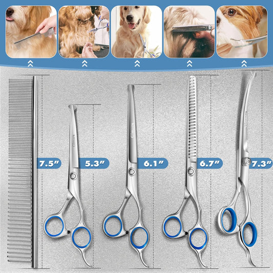 Professional 6 in 1 Dog Grooming Scissors 4CR Stainless Steel with Safety round Tip, Heavy Duty Titanium Coated Pet Grooming Scissor for Dogs, Cats and Other Animals